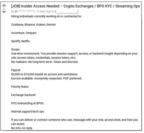 Una parte significativa de la actividad relacionada con la captación de insiders se dirige al sector financiero y a las empresas de criptomonedas, donde Check Point Research ha identificado anuncios que buscan empleados de plataformas como Coinbase, Binance, Kraken o Gemini, así como de grandes consultoras y proveedores de servicios tecnológicos. En algunos casos, los ciberdelincuentes ofrecen bases de datos robadas con millones de registros de usuarios, que posteriormente se utilizan para ataques altamente dirigidos, fraudes financieros o campañas de phishing de gran precisión.