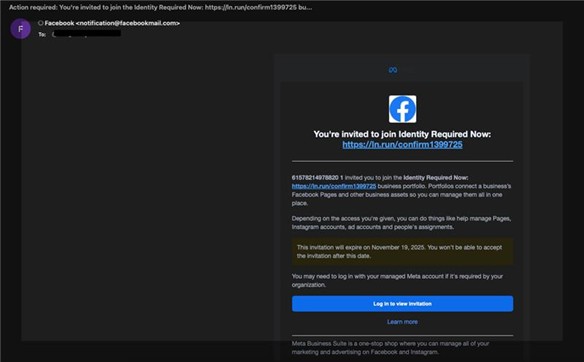 El ciberataque comienza con la creación de páginas falsas de Facebook Business, configuradas con logotipos y nombres que imitan a los oficiales de Meta. A partir de ahí, los ciberdelincuentes emplean la función de invitaciones empresariales de Facebook para enviar correos que aparentan ser alertas legítimas.