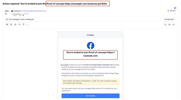 Los investigadores de Check Point Software validaron esta técnica mediante un experimento interno en el que crearon una página empresarial falsa y añadieron un mensaje con enlace; además, aplicaron un logotipo similar al de Meta y utilizaron el propio sistema de invitaciones de la plataforma para enviar correos de prueba.