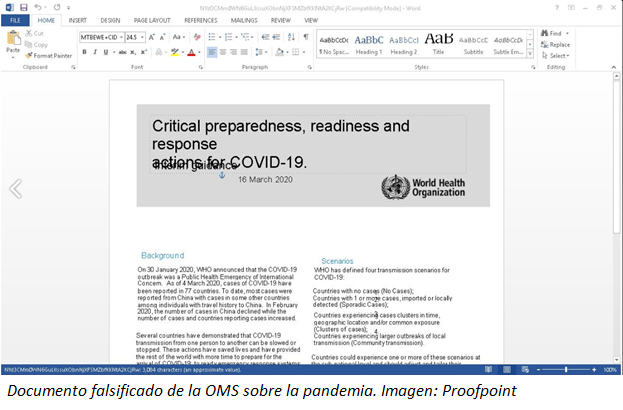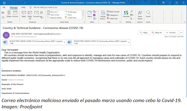 Las cuentas desde las que se remitían dichos mensajes apuntaban al grupo TA413 como autor de la amenaza, pese a que su actividad había estado ligada hasta entonces a históricas campañas en contra de la diáspora tibetana. Así, desviándose de su blanco habitual de ataques, este grupo de ciberespionaje asociado a los intereses del gobierno chino recurrió al exitoso gancho de la Covid-19 para recopilar información acerca de la salud de las economías occidentales en mitad de la pandemia, aprovechándose de la situación de urgencia mundial para atraer a sus víctimas con un nuevo malware lejos de definirse como innovador.