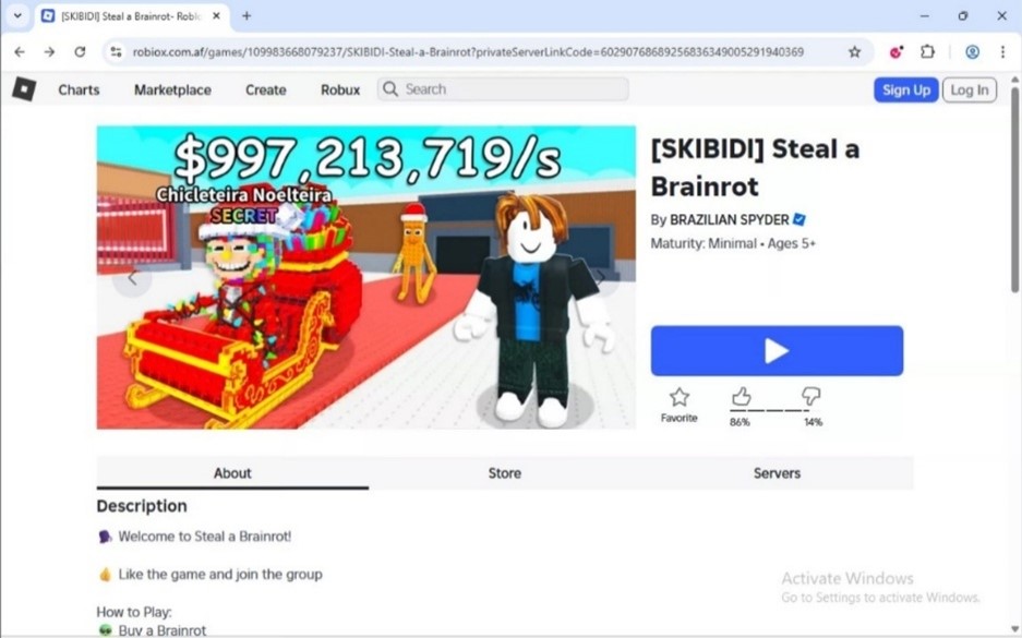 La página de destino presentaba un juego falso de Roblox titulado “SKIBIDI Steal a Brainrot”, con elementos visuales realistas, valoraciones y un destacado botón de “Play”. El contenido imitaba de cerca uno de los juegos más populares actualmente en la plataforma Roblox y estaba claramente diseñado para atraer a los niños, un segmento central de la base de usuarios de la plataforma.