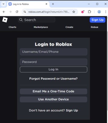 En el cuarto trimestre de 2025, CPR identificó una campaña de phishing con temática de Roblox observada a través de la actividad de navegación de los usuarios. El sitio malicioso estaba alojado en un dominio imitador, robiox[.]com[.]af, que se diferenciaba del legítimo roblox.com por una sutil sustitución de letras.