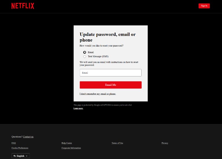 La página de phishing reflejaba estrechamente la interfaz oficial de inicio de sesión y recuperación de cuentas de Netflix, solicitando a los usuarios que introdujeran su dirección de correo electrónico o número de móvil y contraseña. El objetivo era directo: la recolección de credenciales para la toma de control de cuentas, lo que podría permitir su reventa o un fraude posterior.