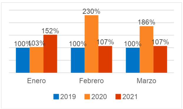 Comparación del número de ataques DDoS por meses. Los datos de 2019 se consideran el 100%