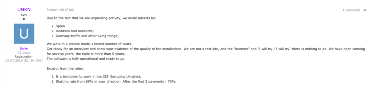 Estos actores se reúnen en foros especializados de la darknet en los que se pueden encontrar anuncios actualizados regularmente ofreciendo servicios y acuerdos de colaboración. Los grandes actores que operan por su cuenta no frecuentan este tipo de sitios, sin embargo, grupos conocidos como REvil, que ha incrementado sus ataques a organizaciones en los últimos trimestres, publican sus ofertas y novedades de forma regular utilizando programas de afiliados. Este tipo de participación supone una asociación entre el operador del grupo de ransomware y el afiliado. En ella el operador del ransomware se lleva una parte de los beneficios – entre el 20 y el 40%- mientras que el 60-80% restante es para el afiliado.