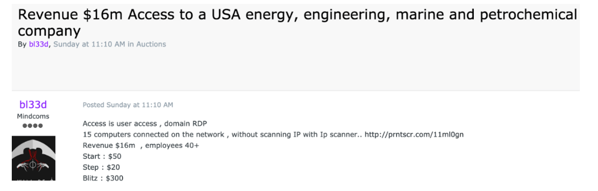 Ejemplo de una oferta para vender el acceso al RDP de una organización