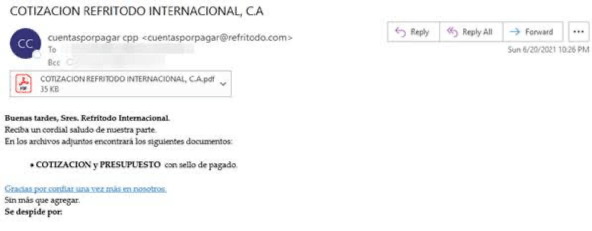 En las campañas analizadas, si bien el punto de mira está repartido entre compañías de numerosos sectores —fabricación, automoción, alimentación y bebidas, medios de comunicación y entretenimiento, banca, seguros o agricultura—, los atacantes suelen dirigirse a un grupo reducido de individuos con apellidos comunes en español, como Pérez, Castillo u Ortiz. Estos reciben un email cuyo cebo responde a asuntos relacionados con pagos —»presupuesto», «cotización» o «recibo»— enviado desde una dirección de Gmail o Hotmail. De ahí viene precisamente el curioso apodo con el que Proofpoint llama a los ciberdelincuentes TA2721: «bandidos calientes» (por «hot» de Hotmail).