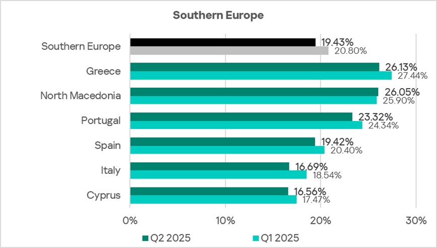 En el segundo trimestre de 2025, el 8,35% de los ordenadores ICS del sur de Europa bloquearon ataques procedentes de Internet. En España, la cifra fue similar (8,09%), mientras que Macedonia del Norte lideró esta categoría con un 11,47%.