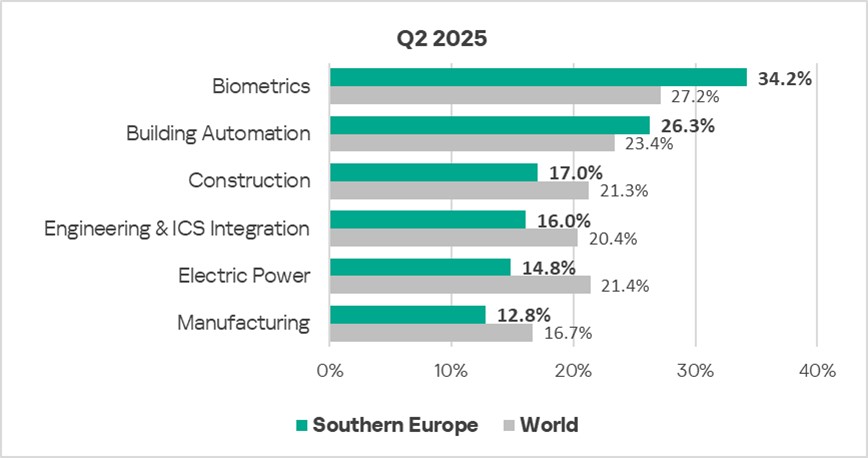 En el segundo trimestre de 2025, los sectores más afectados en el sur de Europa fueron la biometría (34,2%) y la automatización de edificios (26,3%), ambos muy por encima de la media global (27,2% y 23,4%, respectivamente). En cambio, industrias como la construcción (17,0%), la ingeniería e integración ICS (16,0%), la energía eléctrica (14,8%) y la manufactura (12,8%) registraron cifras inferiores a la media mundial.