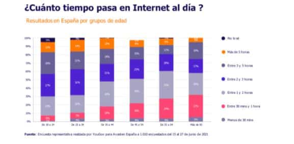 Al margen de las tareas relacionadas con el trabajo, el estudio ha revelado que los españoles de entre 18 y 24 años son los que más tiempo pasan en Internet, con un 38% de ellos dedicando más de tres horas al día, en comparación con el sólo el 19% de las personas de 55 a 64 años y el 24% de las mayores de 65. A nivel global los porcentajes son más altos: un 51% de los usuarios de entre 18 y 24 años pasa más de tres horas al día en Internet, mientras que entre los de 55 a 64 el porcentaje baja al 31% y en los mayores de 65 se queda en el 30%