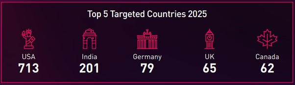 El informe destaca que Estados Unidos lidera el ranking de países afectados con 713 incidentes, seguido de India (201), Alemania (79) Reino Unido (65) y Canadá (62%). Esto demuestra que las potencias industriales son el foco principal de estas campañas.