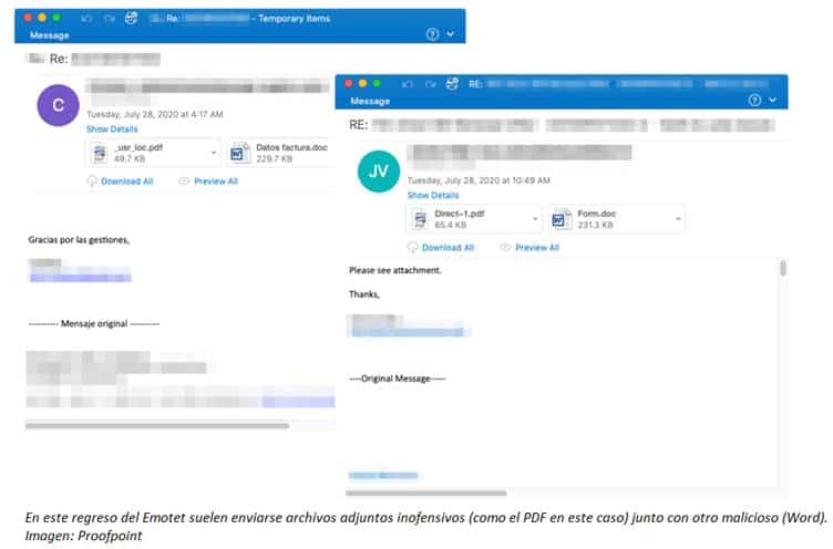 Otra característica es que buena parte de los emails con Emotet responde a alguna conversación previa a través de esta misma vía, por lo que el asunto empieza con «Re:» o «RE:» y, a continuación, el tema del correo robado. Aunque las campañas de Emotet se envían normalmente de lunes a viernes, en esta ocasión hubo algunas excepciones, concretamente, el TA542 no mandó emails maliciosos el viernes, 24 de junio; lunes, 3 de agosto; martes, 4 de agosto; ni tampoco entre 17 de julio ni el 18 de agosto. Antes de la reaparición de Emotet, se dieron señales de que esto sucedería. Investigadores de Proofpoint ya detectaron el 14 de julio correos electrónicos con antiguas URLs de Emotet cuyo remitente  procedía de numerosas IP, como si se hubiesen reactivado múltiples bots Emotet. Con todo, e independientemente de que los señuelos, mecanismos de entrega u objetivos geográficos sean similares a los que se habían observado en un pasado o cambien ahora, lo que sí destacan en Proofpoint es que Emotet no ha perdido potencia como amenaza altamente dañina.