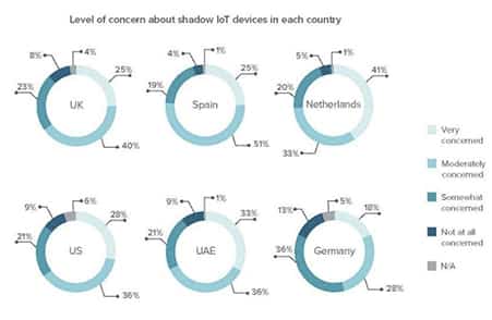 La preocupación entre los profesionales españoles es mayor: un 76% manifiesta estar muy o moderadamente preocupado por la amenaza que suponen los dispositivos no controlados. Un 19% dice estar algo preocupado y menos del 4% dice no estar preocupado en absoluto. Alemania es el país en que el grado de preocupación es menor.