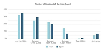 En términos globales, un 62% de los profesionales encuestados manifiesta tener más de 1000 dispositivos “Shadow IT” conectados en su red. Por países, las cifras varían considerablemente. El país que presenta menor número de dispositivos no controlados es Estados Unidos, ya que sólo un 48% de los encuestados manifiesta tener más de 1.000 dispositivos no controlados, seguido de España, con un 58%. En el otro extremo están Alemania y Países Bajos, en el que el 70% de los encuestados dice tener más de 1.000 dispositivos no controlados.