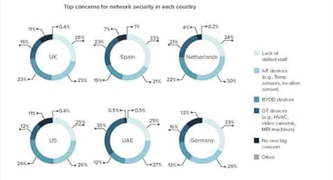 A aquellos responsables de TI que han manifestado su preocupación por las amenazas de red se les ha preguntado también por las principales causas de dicha preocupación. En general, es precisamente la presencia de dispositivos IoT no controlados o securizados la preocupación (25%) más importante después de la falta de personal cualificado para gestionar este tipo de entornos (28%). Les sigue la presencia de dispositivos BYOD en la red (19%) y equipamiento industrial (sistemas de aire acondicionado, videocámaras, equipos médicos, 18%). En España, los resultados son similares, aunque la preocupación por la falta de personal cualificado es ligeramente superior (33%).