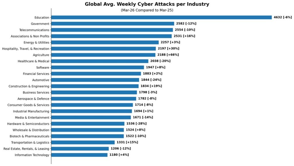 Por sectores, la Educación volvió a ser el más atacado a nivel mundial, con una media de 4.632 ciberataques semanales en marzo, lo que supone un descenso interanual del 6%. Las instituciones gubernamentales les siguieron con 2.582 ataques semanales (-12% interanual), mientras que las telecomunicaciones quedaron en tercer lugar al promediar 2.554 ataques a la semana (-10% interanual).