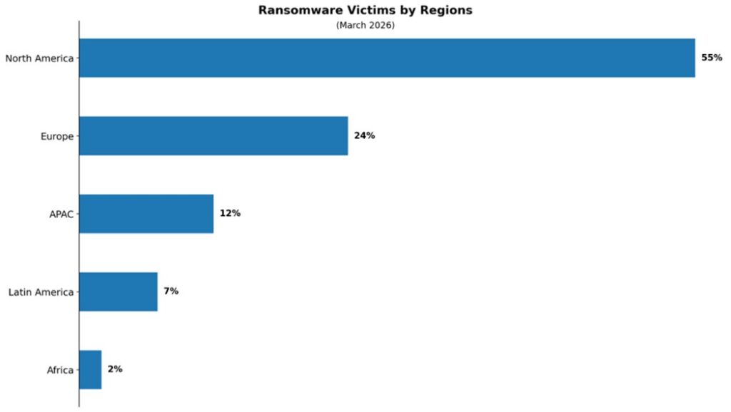 En cuanto a los ataques por región, América del Norte fue la más afectada, con el 55% de los incidentes de ransomware reportados, seguida de Europa con el 24% y APAC con el 12%. Aunque Norteamérica sigue siendo la región más afectada, Europa mostró un aumento notable, pasando del 17% en febrero de 2026 al 24% este mes. En cuanto a países, Estados Unidos fue el más impactado, con el 52% de los ataques de ransomware reportados, seguido de Alemania con un 5% y Francia con un 4%.