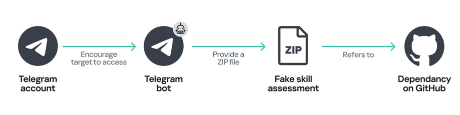 En la campaña GhostHire, el grupo APT se hace pasar por reclutadores para dirigirse a desarrolladores del ámbito blockchain. A través de esta táctica, inducen a las víctimas a descargar y ejecutar un repositorio de GitHub infectado con malware, que presentan como una prueba de evaluación técnica. Aunque GhostHire comparte infraestructura y herramientas con GhostCall, su enfoque es distinto: en lugar de llamadas falsas, recurre a procesos de selección simulados para llegar a ingenieros con perfil técnico. Tras el primer contacto, la víctima es incorporada a un bot de Telegram que le envía un archivo ZIP o un enlace a GitHub, con una fecha límite para completar la tarea. Al ejecutarlo, el malware se instala en el sistema, adaptado al sistema operativo correspondiente.