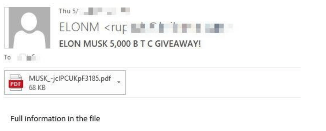 El 79,72% de los correos electrónicos fraudulentos parecen enviarse desde direcciones IP en Alemania, dirigidos a usuarios de Europa y América del Norte. El 11% de los correos electrónicos fraudulentos han llegado a usuarios en el Reino Unido, el 79,26% en Suecia y el 9,22% en los EE. UU. Los ciberdelincuentes mezclan y combinan líneas de asunto, nombres en PDF y mensajes para evitar los filtros de spam. Por ejemplo, en una versión de la estafa criptográfica, la línea de asunto dice: «¡ELON MUSK 5,000 B T C GIVEAWAY!» mientras que otros son específicos del objetivo y contienen el nombre de usuario de las víctimas delante del título principal.