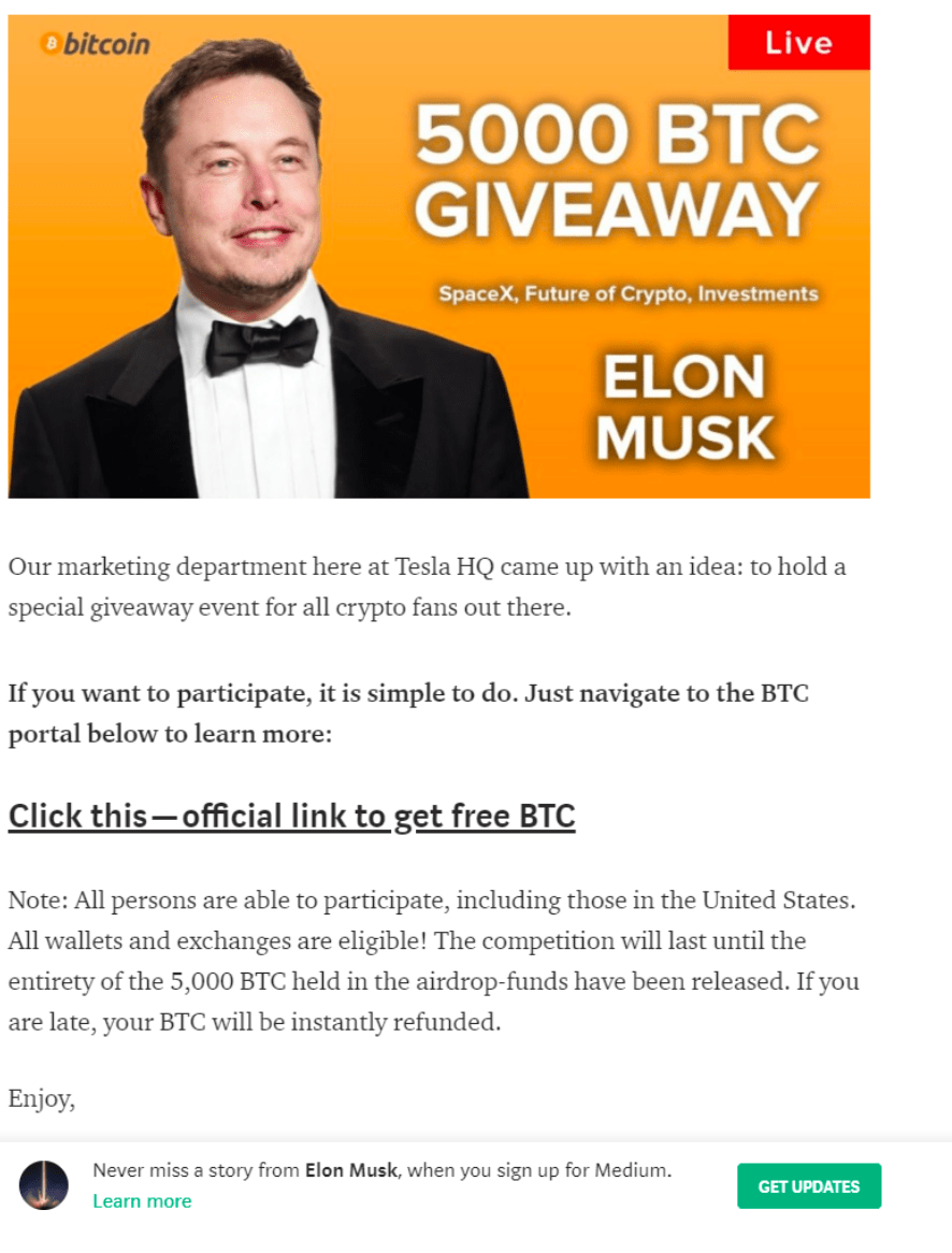 «Nuestro departamento de marketing aquí en Tesla HQ tuvo una idea: realizar un evento de obsequio especial para todos los fanáticos de las criptomonedas», se lee en el anuncio. La inserción de una nota al final indica que «todas las personas pueden participar, incluidas las de los Estados Unidos. ¡Todas las carteras e intercambios son elegibles! La finalización durará hasta que se hayan liberado la totalidad de los 5,000 BTC retenidos en los fondos de lanzamiento aéreo. Si llega tarde, su BTC se reembolsará instantáneamente «.