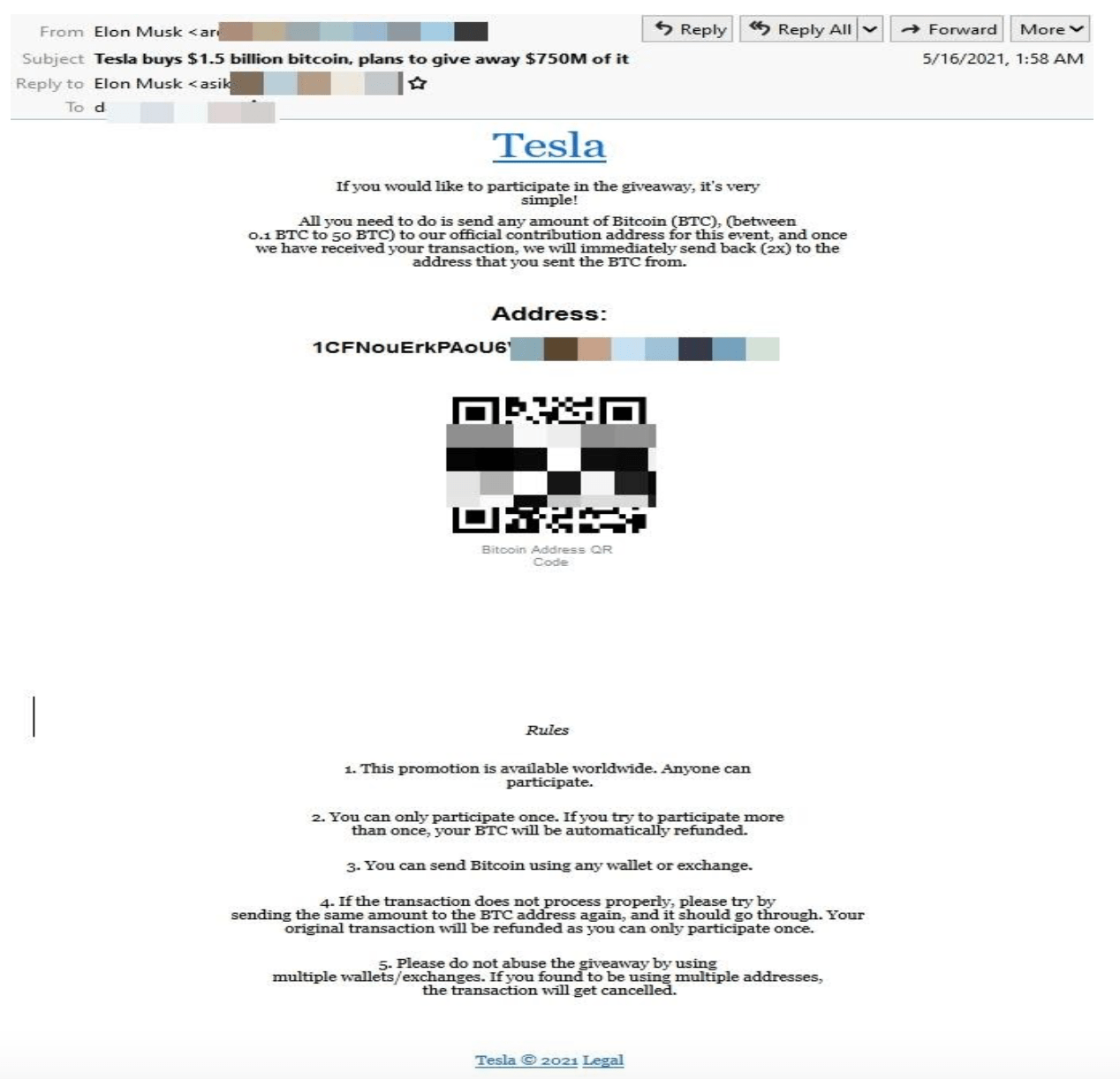 Esta campaña comenzó el 15 de mayo. Los spammers envían decenas de miles de correos electrónicos fraudulentos que ofrecen a los destinatarios la oportunidad de participar en un sorteo de Bitcoin supuestamente organizado por el departamento de marketing de Tesla.