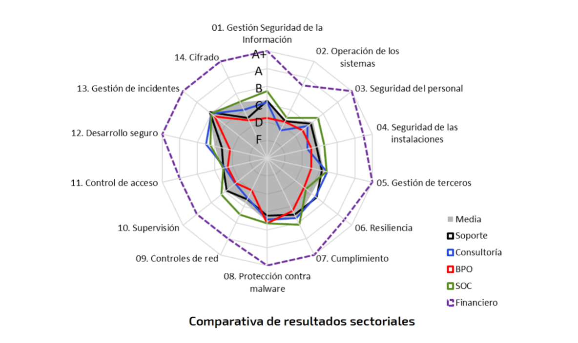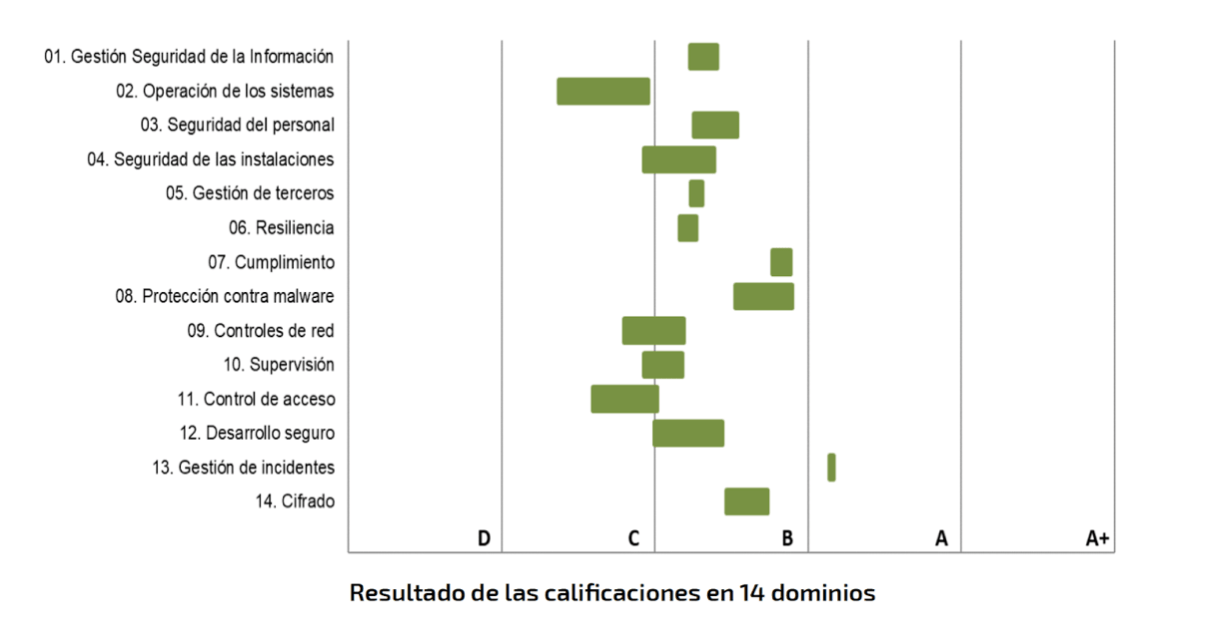 Este estudio se ha llevado a cabo comparando los 14 dominios diferentes que la empresa evalúa para otorgar un tipo de calificación de seguridad. Esta calificación cuenta con cinco niveles distintos, que abarcan desde la A+ hasta la D, exigiendo ya desde el nivel ‘D’ el cumplimiento de unas medidas básicas de seguridad y correspondiendo el nivel ‘A+’ al mejor conjunto de medidas.