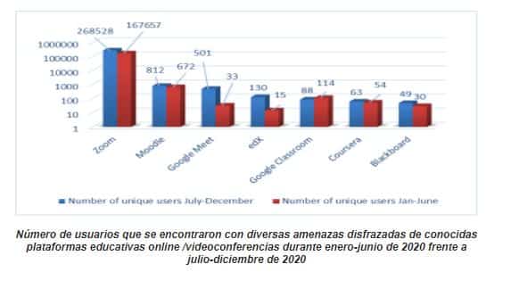 De enero a junio de 2020, el número total de usuarios que se encontraron con diversas amenazas distribuidas bajo la apariencia de conocidas plataformas educativas online y aplicaciones de videoconferencia fue de 168.550, lo que supone un aumento del 20% en comparación con el mismo período de 2019. Según los expertos de Kaspersky la cifra continuó creciendo durante el segundo semestre, hasta alcanzar los 270.171 en enero de 2021, un 60% más comparado con la primera mitad de 2020.