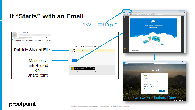 El phishing de SharePoint generalmente comienza con el compromiso de la cuenta en la nube. Una vez conseguido el control de la cuenta, el atacante carga un archivo malicioso y luego cambia los permisos de uso compartido del archivo a «Público» para que el nuevo enlace anónimo pueda compartirse con cualquier persona. El atacante envía el enlace por correo electrónico o comparte el enlace con los contactos del usuario u otras cuentas específicas, internas o externas. Cuando los destinatarios abren el archivo y hacen clic en el enlace malicioso insertado, son víctimas de phishing, y esto vuelve a iniciar todo el ciclo nuevamente. Estos ataques pueden generar un robo de datos o diferentes formas de fraude electrónico, como el fraude en la cadena de suministro.