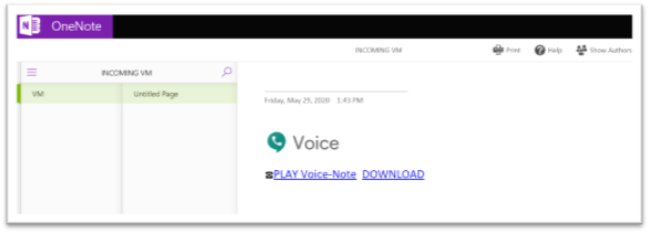 A continuación, se muestra un ejemplo de un ataque que usa SharePoint para alojar un archivo de OneNote malicioso que se hace pasar por correo de voz: