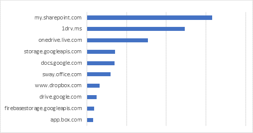 En el primer semestre de 2020, Proofpoint detectó 5,9 millones de mensajes de correo electrónico que contenían enlaces maliciosos de SharePoint Online y OneDrive. Y aunque este volumen de mensajes supone aproximadamente el 1% del total de mensajes que contienen URLs maliciosas, representan más del 13% de los clics de los usuarios. Los usuarios fueron cuatro veces más propensos a hacer clic en enlaces maliciosos de SharePoint, y 11 veces más propensos a hacer clic en enlaces maliciosos de OneDrive. También han puesto de manifiesto que los mensajes se distribuyeron desde más de 5.500 dominios comprometidos, lo que supone una gran parte de la base de clientes empresariales de Microsoft.