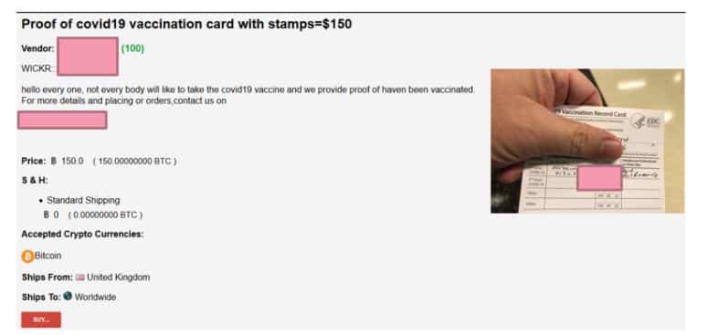 En este sentido, los ciberdelincuentes se han dado cuenta rápidamente del enorme potencial del mercado de la falsificación de estos documentos, y se han apresurado a aprovechar la oportunidad de obtener beneficios. En un anuncio de la Darknet, un cibercriminal, supuestamente del Reino Unido, ofrece una tarjeta de vacunación por 150 dólares, aceptando criptomonedas como método de pago: