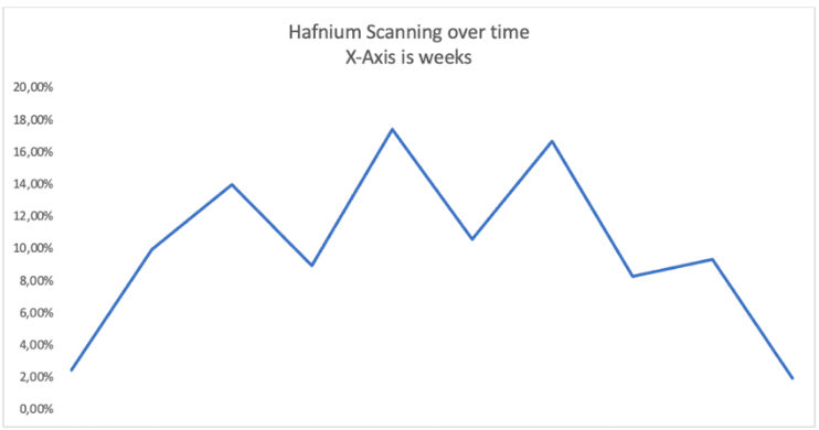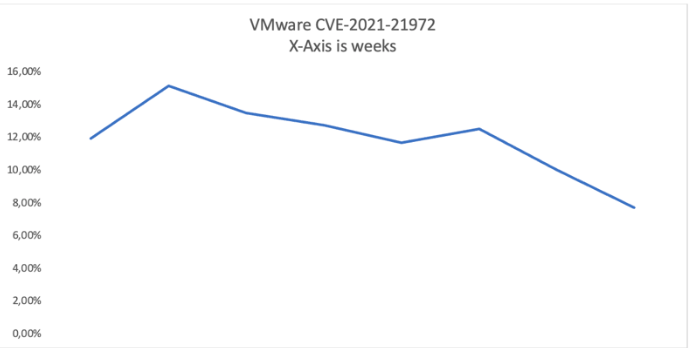 En el caso de VMware, se identificaron las vulnerabilidades CVE-2021- 21972 y CVE-2021-21973 el 24 de febrero de 2021. También se han visto pruebas periódicas para CVE-2021-21972 con regularidad, con cierta desaceleración en el escaneo. Dicho esto, se espera ver un aumento de los mismos a medida que los atacantes recorren la lista de vulnerabilidades conocidas de alto impacto.