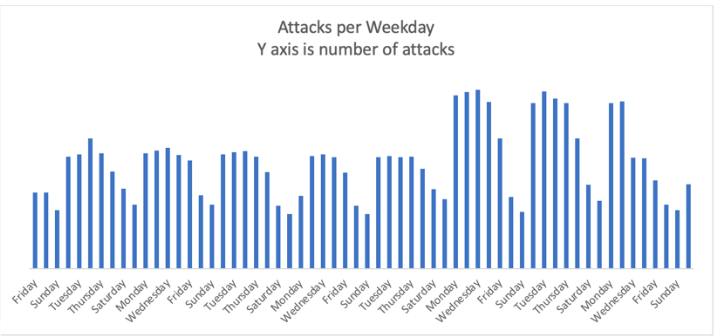 A la hora de analizar los ataques, también se han identificado patrones. Al principio se observó que los bots seguían el curso de un día laborable para realizar los ataques, y actualmente ese patrón se ha mantenido estable también durante la semana. Estos datos demuestran que la mayoría de los atacantes se toman el fin de semana libre, incluso cuando activan tareas automatizadas. Esto es así porque es mas fácil ocultarse entre la multitud cuando llevas a cabo este tipo de actividades, en lugar de hacer saltar las alarmas atacando a los sistemas inactivos al final de la semana.