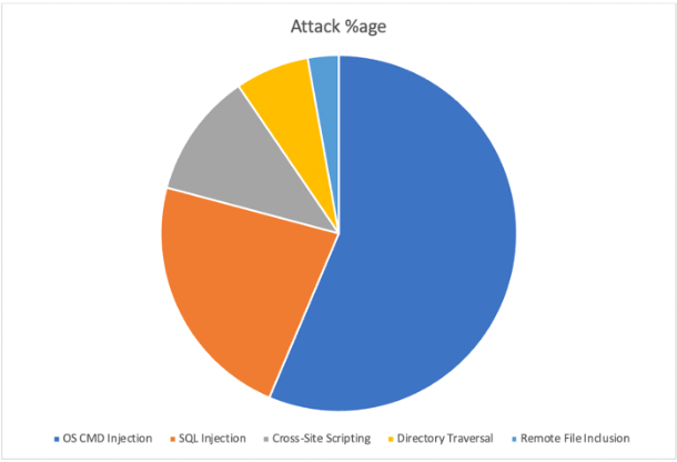 El estudio también analizó cuántos de los ataques que se realizan son ataques comunes. Estos incluyen intentos de reconocimiento/fuzzing y ataques contra vulnerabilidades de aplicaciones (WordPress fue el más popular). Por lo general, esperaríamos ver muchos ataques de inyección de SQL, seguidos de ataques de inyección de comandos y luego cualquier otro tipo de ataque. Sin embargo, esta vez, la inyección de comandos fue, con mucha diferencia, el líder, y el reporte señala muchos intentos de este estilo en Windows.