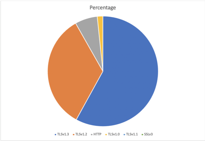 En lo que respecta al tráfico de las implementaciones en todo el mundo, el último TLS1.3 es el líder indiscutible, seguido de TLS1.2. Esta es una buena noticia, dado que estos son los protocolos más seguros. Es cierto que algunas implementaciones todavía usan HTTP simple, pero la parte más interesante es que el tráfico HTTP simple es mayor en volumen que los protocolos SSL / TLS más antiguos e inseguros.